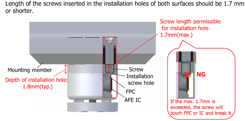 Yes, the lower mounting tapped holes are through holes and screws that are too long will damage the flex cable inside the sensor causing permanent damage.