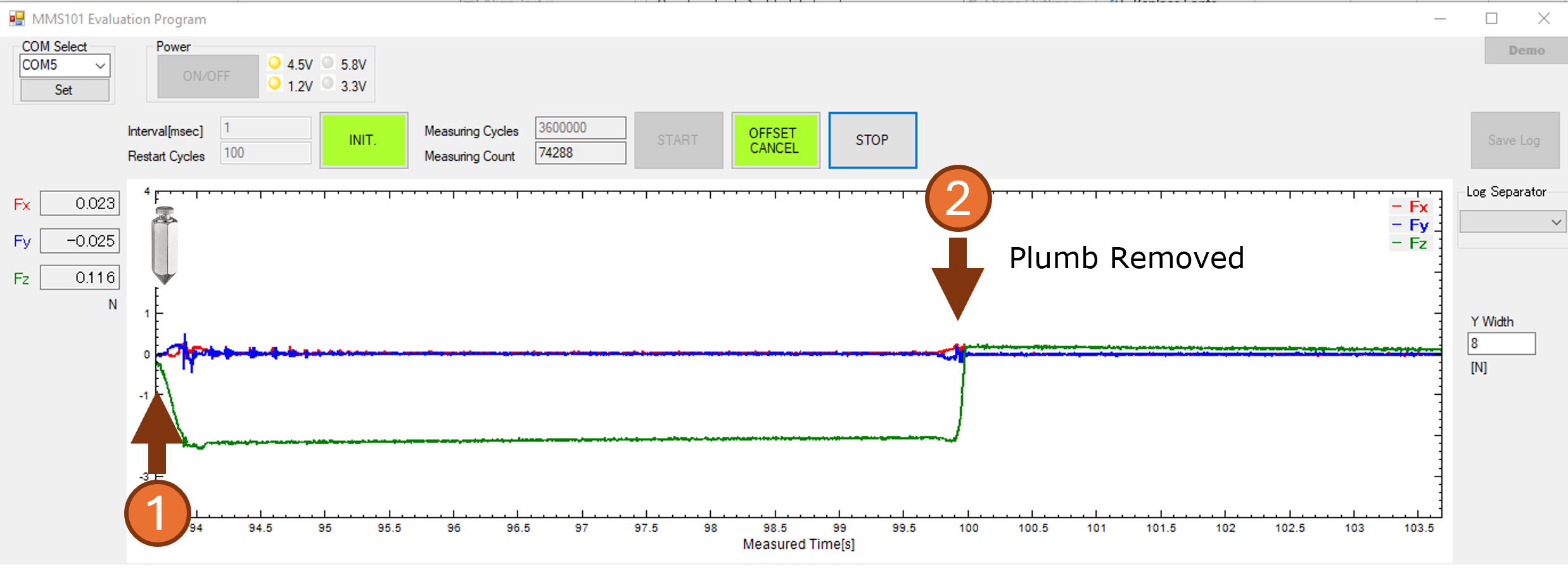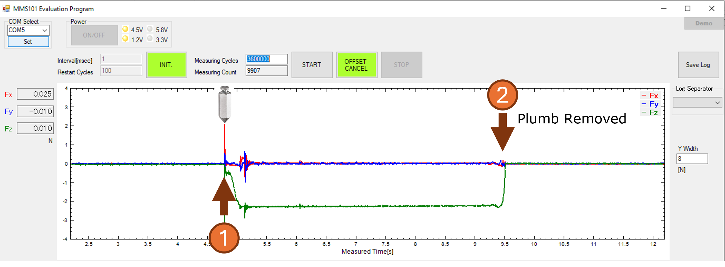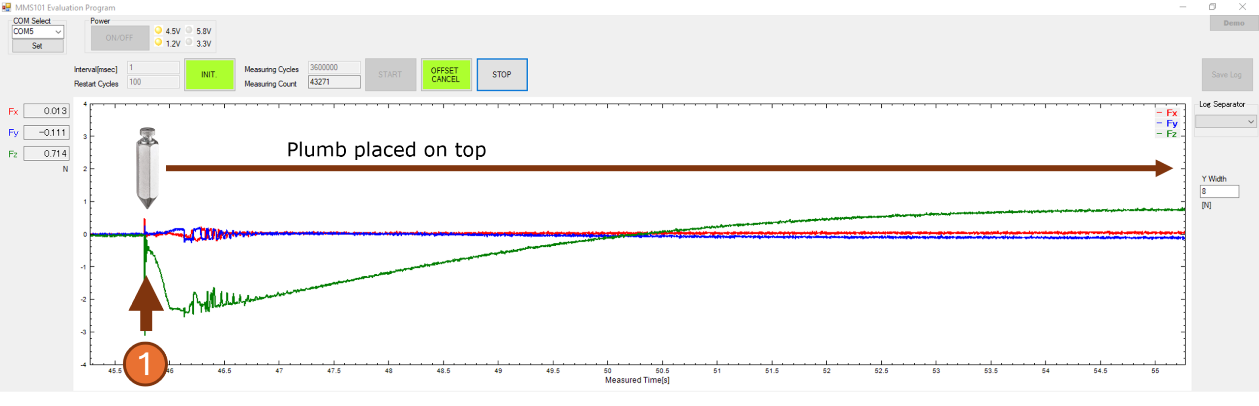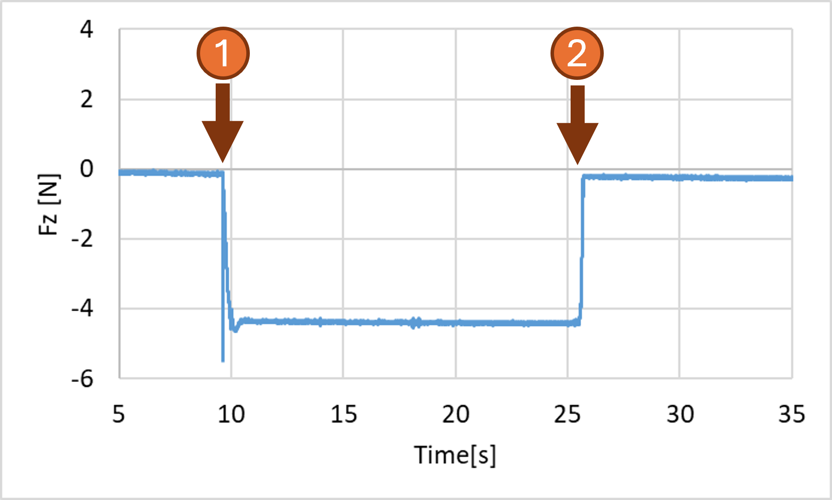The left graph shows then sensor mounted on both ends and weight* is placed ① on top of the upper plate to load the Z-axis. At around 25 seconds, the weight is removed ②.