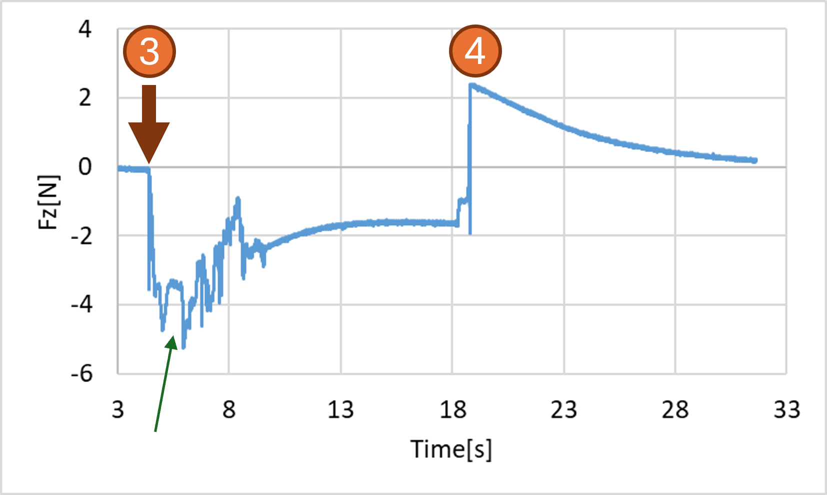 The right graph shows the sensor mounted only to a lower plate and weight is placed ③ on top of the sensor to load the Z-axis. At after 18 seconds, the weight is removed ④.